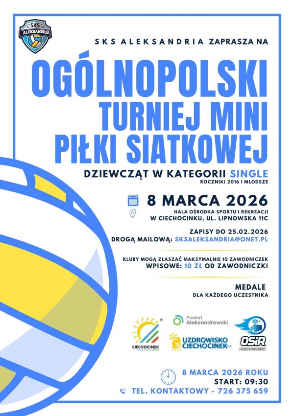 | Opis: | SKS Aleksandria zaprasza młode zawodniczki do udziału w ogólnopolskim turnieju mini piłki siatkowej, który odbędzie się w Ciechocinek. Wydarzenie ma na celu popularyzację aktywności sportowej wśród najmłodszych, rozwijanie umiejętności siatkarskich oraz integrację środowiska sportowego w atmosferze zdrowej rywalizacji. Turniej przeznaczony jest dla dziewcząt z rocznika 2016 i młodszych, rywalizujących w kategorii single. Zawody rozpoczną się 8 marca 2026 roku o godzinie 09:30 w hali sportowej Hala OSiR Ciechocinek przy ul. Lipnowskiej 11C. Opłata startowa wynosi 10 zł od zawodniczki. Każdy klub może zgłosić maksymalnie 10 uczestniczek. Termin nadsyłania zgłoszeń upływa 25 lutego 2026 roku. Zgłoszenia należy przesyłać drogą mailową na adres: sksaleksandria@onet.pl. Każda uczestniczka turnieju otrzyma pamiątkowy medal. Organizatorzy zapraszają do udziału w wydarzeniu, które łączy sportową rywalizację z dobrą zabawą i okazją do zdobycia pierwszych turniejowych doświadczeń. W przypadku pytań organizacyjnych dostępny jest kontakt telefoniczny: 726 375 659. |