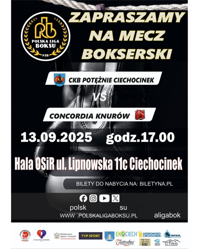 | Opis: | Zapraszamy na 8. kolejkę Polskiej Ligi Boksu! Nasz zespół CKB Potężnie Ciechocinek zmierzy się z drużyną Concordia Knurów. To będzie wieczór pełen emocji, sportowej rywalizacji i widowiskowych pojedynków! |