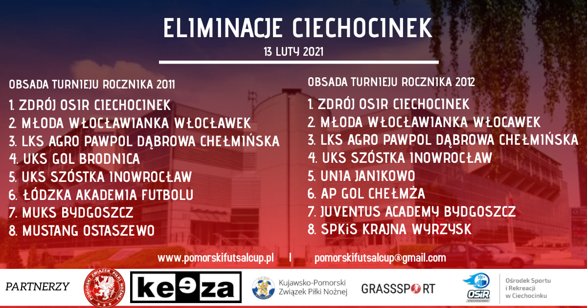 W sobotę i niedzielę 13 -14 lutego 2021 roku w Hali Sportowej OSiR w Ciechocinku odbędzie się Pomorski Futsal Cup-turniej halowy dla dzieci roczników 2009-2012 pod patronatem Burmistrz Ciechocinka. Poniżej przedstawiamy drużyny, które wezmą udział w turnieju rocznika 2009-2012, a także daty turniejów dla innych roczników.Impreza zgodnie z panującymi ograniczeniami musi odbyć się bez udziału publiczności ale dzięki firmie ITTAM będzie możliwość obejrzenia jej online.