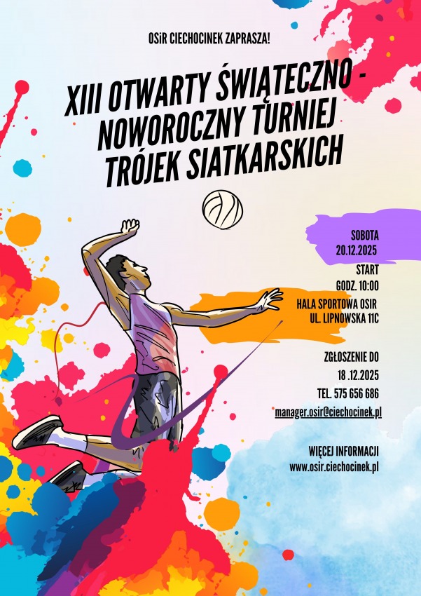 | Opis: | W sobotę, 20 grudnia w Hali Sportowej odbędzie się XIII Otwarty Świąteczny Turniej Trójek Siatkarskich. Początek gier od godziny 10.00 - weryfikacja od godziny 9.30. Uwaga! Ilość miejsc ograniczona! Serdecznie zapraszamy do udziału! Do pobrania: |